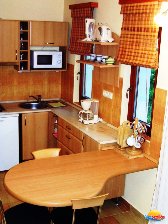 A konyha teljesen felszerelt, minden igényt kielégít (hűtőszekrény, mikrohullámú sütő, kávéfőző, kenyérpitító, vízforraló, edények, stb).