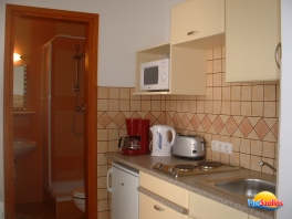 A tetőtéri szobák külön-külön minikonyhával rendelkeznek. A tetőtéri szobákhoz fedett erkély, a földszinti szobákhoz terasz tartozik. A szobák többsége pótágyazható.