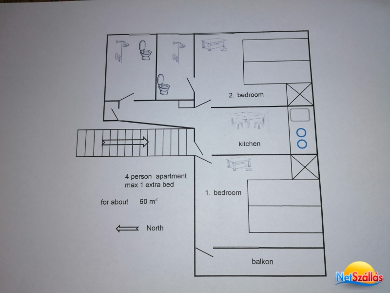 1 db, 4 fős (két szobás, 2 fürdőszobás) apartman