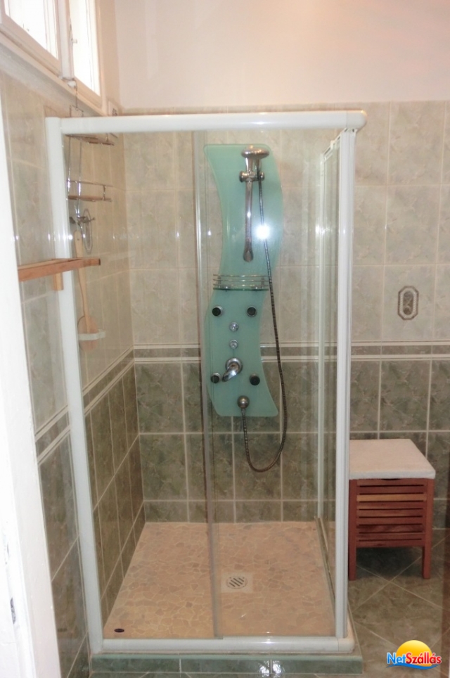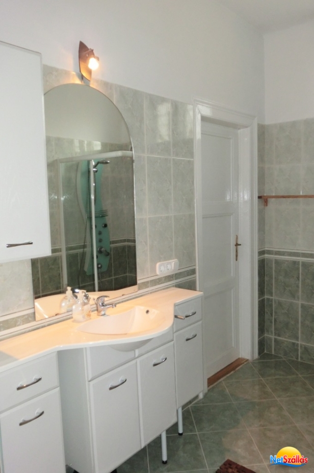 - Fürdőszoba : Mosdó, fürdőszobaszekrény tükörrel, extra nagy 1x1 m-es masszázs-sugaras zuhanyzó