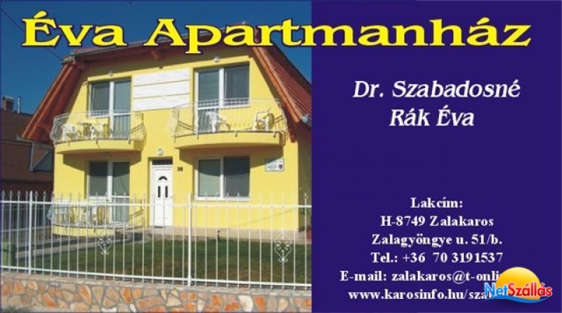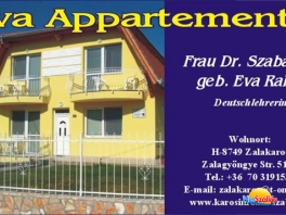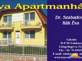 A nemrég épült ÉVA-apartmanház 2. a gyógyfürdő felett, attól 350 méterre, Zalakaros zöldövezeti, panorámás részén, a Zalagyöngye utcában található. Családias hangulatú, új apartmanházunk nagyrészt 2 személyes(pótágyazható) praktikusan berendezett, ízléses apartmanokból áll.A kétszemélyes stúdióapartmanoknál a hálórésszel közös légtérben található a konyhasarok, minikonyhával, teljes felszereléssel, (hűtőszekrény, mikrohullámú sütő, kávéfőző, stb), étkezőasztallal, székekkel. Minden apartmanhoz fürdőszoba, wc továbbá bútorozott erkély vagy terasz tartozik.A családi apartman részei: hálószoba, nappali-étkező, konyha, fürdőszoba WC-vel.