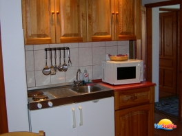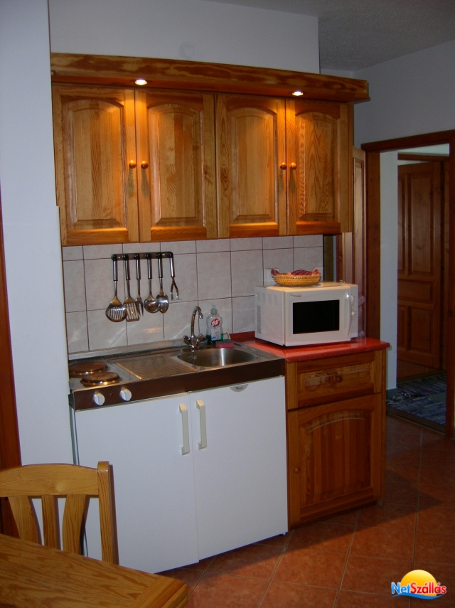 A konyharész konyhabútorral, 4-6 személyes étkezővel, étkészlettel, edényekkel, főzőlappal, mikrohullámú sütővel, mosogatóval, hűtőszekrénnyel, kávé és teafőzővel ellátott.