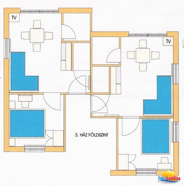 Minden apartmanhoz fürdőszoba és külön bejáratú WC tartozik. A nappalik környezetbarát fenyő bútorokkal berendezettek. 1 db 4-6 személy befogadására alkalmas lakosztályban két hálószoba van.
