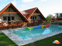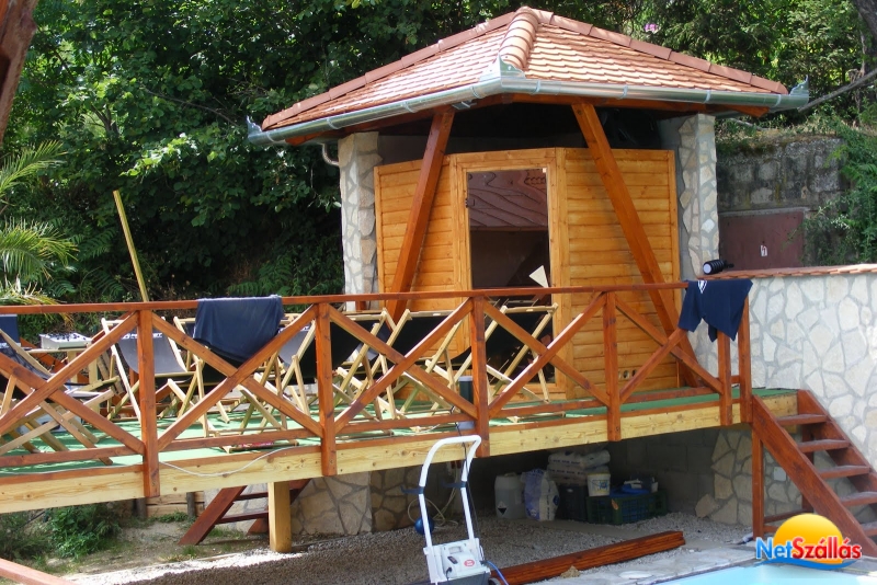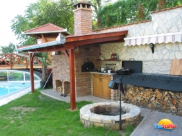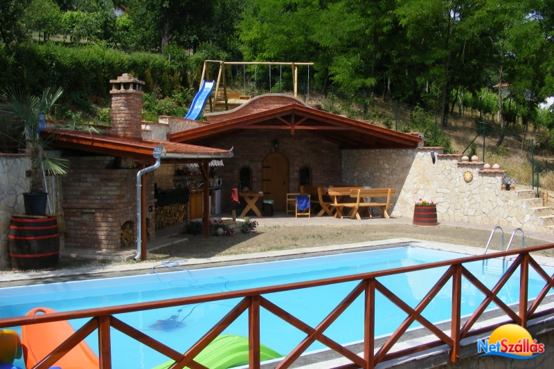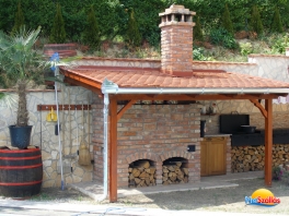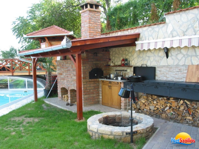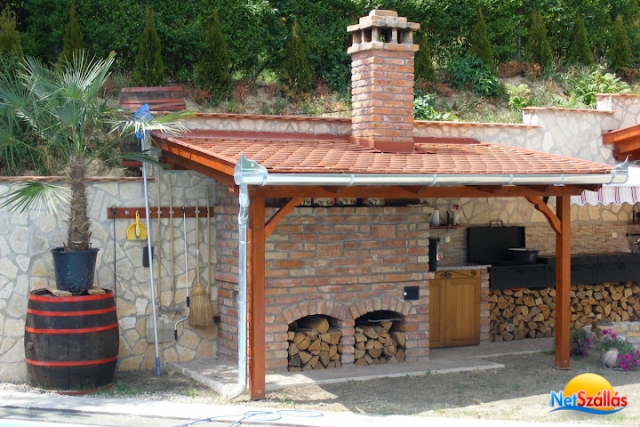 Grillkonyha: a borospince mellet grill, 2 gázégő, tárcsa, bográcsállvány, gránit munkaasztal, hűtő, mosogatógép, felszerelve minden konyha és étkészlettel, 20 főig fedett terasz alatt a pince előtt.