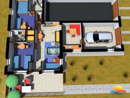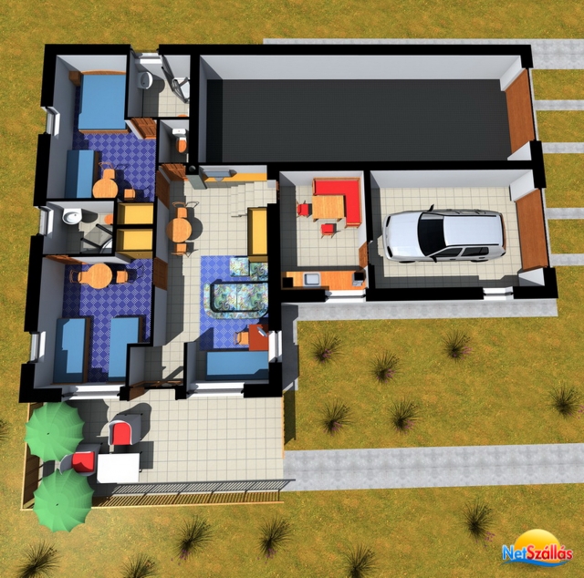 A családi ház földszintjén lévő külön bejáratú apartmanban (mely központi fűtésű) a következő helyiségek állnak rendelkezésére: