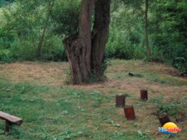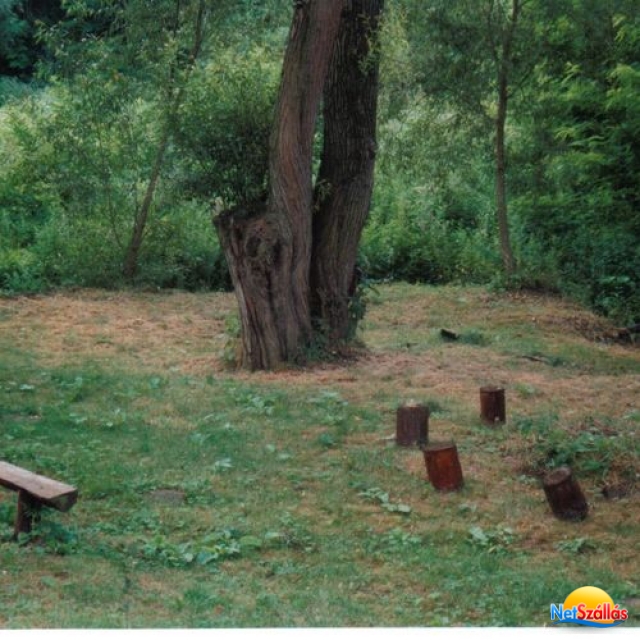 Nem mozgatható: 80 főre földben rögzített fapadok és faasztalok rönkfából.