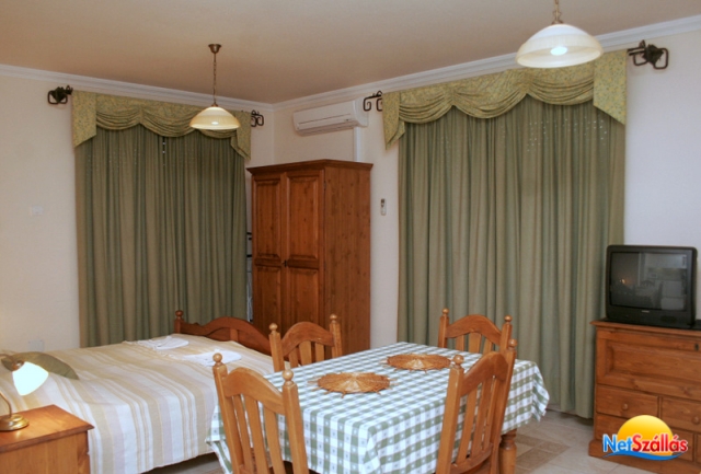 A légkondicionált stúdió apartmanokhoz lakószoba, beépített és hasonlóan teljesen felszerelt konyha, fürdőszoba WC-vel és erkély tartozik kerti bútorokkal. Az apartman ház antikolt fenyőbútorokkal van berendezve. Az ágyakban kiváló minőségű olasz gyógy matracok kerültek elhelyezésre. Valamennyi lakosztályban és apartmanban található 60 csatorna vételére alkalmas TV és telefon. (Saját laptoppal lehetőség van internet hozzáférésre.) A gépkocsik elhelyezését zárt parkoló, valamint garázs biztosítja.