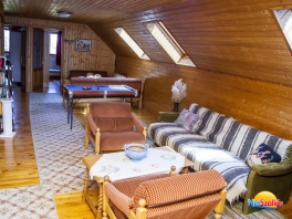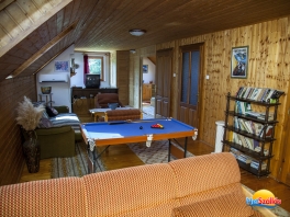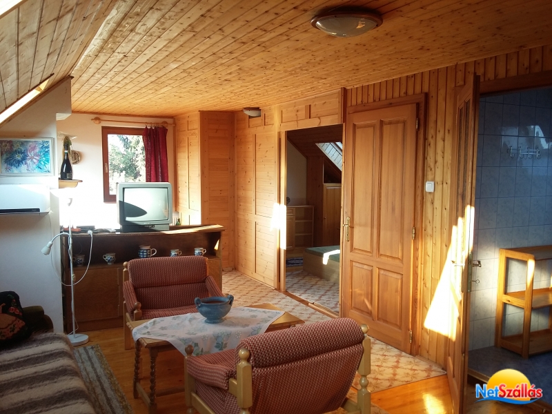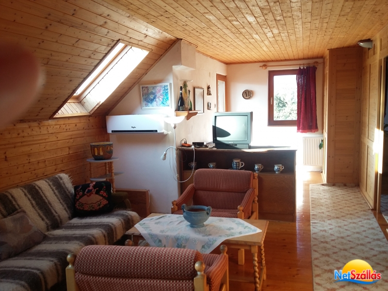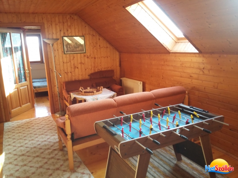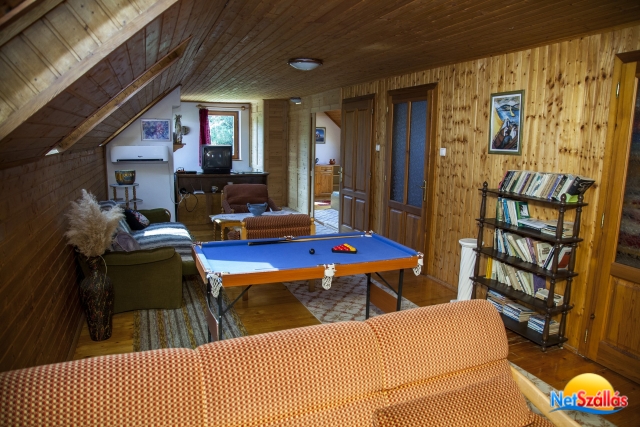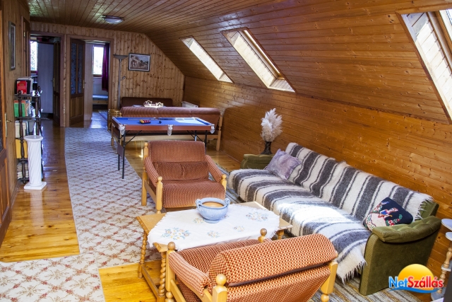 A földszinti társalgó nagy, egy légtérben van az ebédlővel és konyhával, megfelelő teret biztosít 16 fős létszám számára.