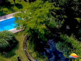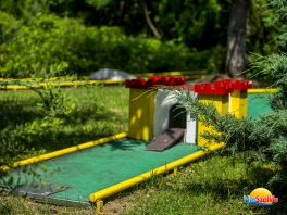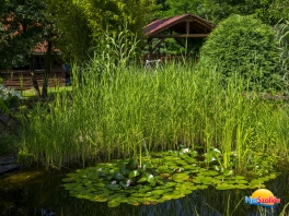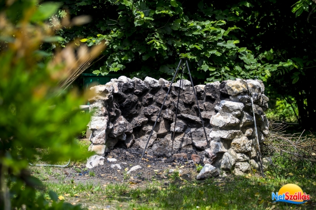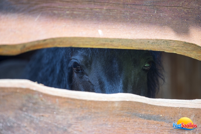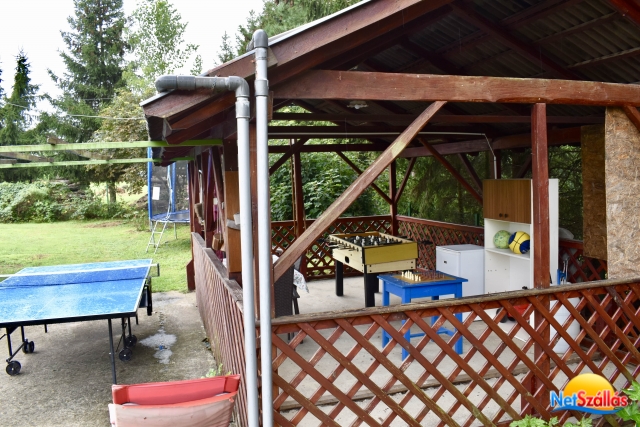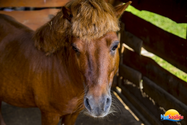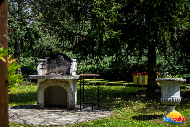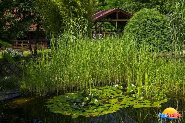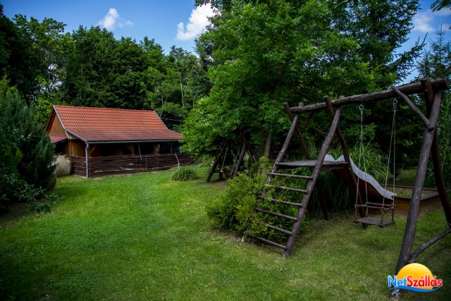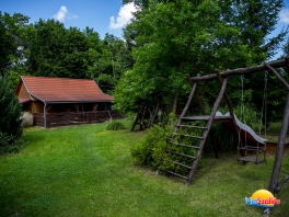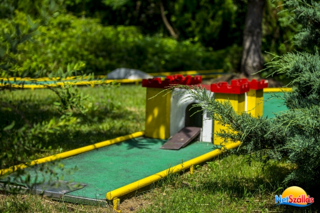 Továbbá: játékpavilon, pergola, grillező, bográcsozó, hinta, trambulin, csúszda, kosár- palánk, kültéri pingpong, 8m×4m×1.2 m tó, kisállat ól 2 póni lóval.
