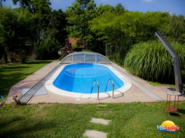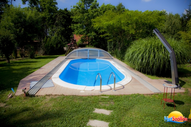 A kertben van egy napkollektorral melegített, 7m×3m×1.2 m medence és zuhanyzó.