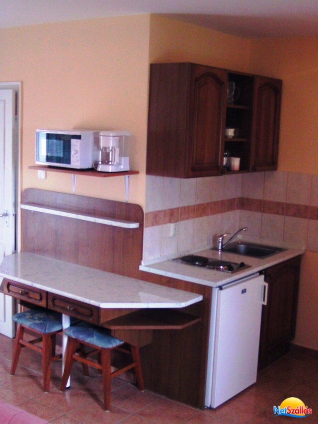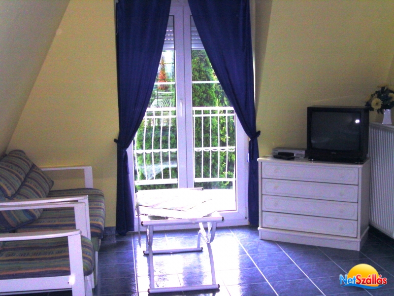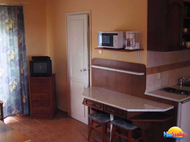 A 3-4 fő részére kialakított apartmanokhoz 2 db 2 ágyas hálószoba, nappali-étkező színes TV-vel, ingyen WiFi, teljesen felszerelt konyha, mikróval, zuhanyzó, WC, 2 db erkély tartozik, ahonnan akár a tőlünk 50 km-re fekvő festői szépségű Badacsonyi hegyet is megcsodálhatják!
