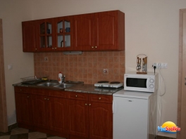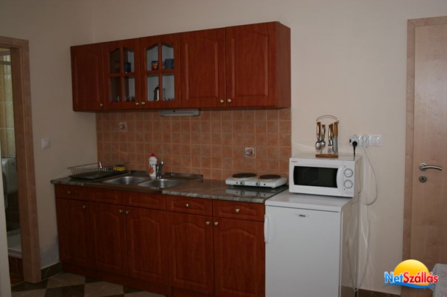 A konyha hűtőszekrénnyel,mikrosütővel,dupla főzőlappal,kenyérpirítóval ellátott.