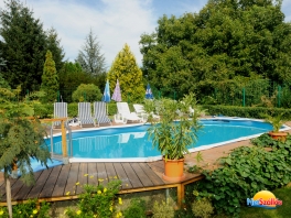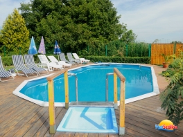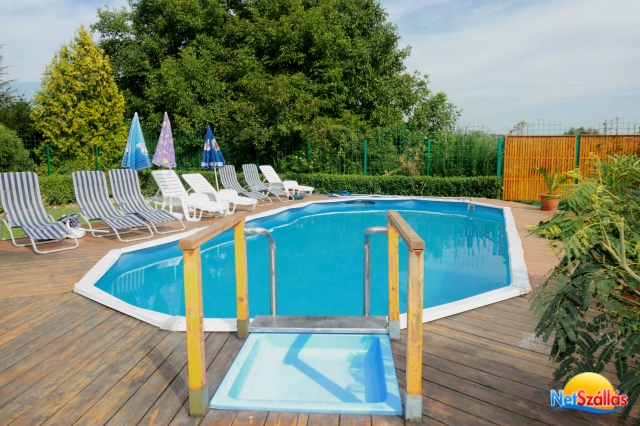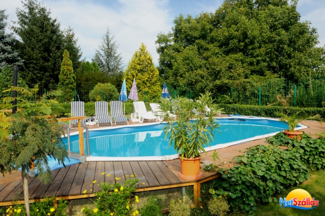 Rendelkezésre áll kültéri úszómedence 10×5 m nagy, 100m2 -es napozóterasz napágyakkal, kerti kiülőkkel berendezve. Szép gondozott pázsit, kerti grill található. Esti beszélgetésekhez, borozgatáshoz nyitott, fedett terasz használható.