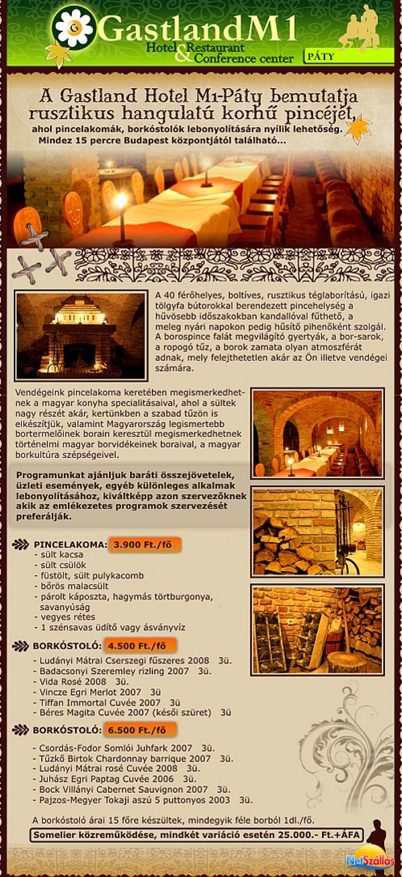 Éttermünk különlegessége a saját, antik tégla-borítású, különleges hangulatú kandallóval rendelkező borpincékben borkóstolással egybekötött pincelakoma szervezhető, ahol a kandalló tüze mellett oldható az egész napos munka feszültsége vagy különleges helyszíne lehet évzáró céges rendezvényeknek is.