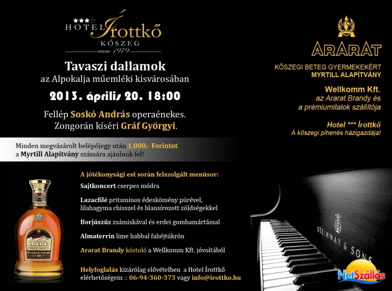 Könnyű tavaszi dallamok Soskó András operaénekes előadásában, Gráf Györgyi zongorakíséretével, 4 fogásos ízletes vacsora és Ararat Brandy kóstoló! Tartalmas program egy emlékezetes estéhez.